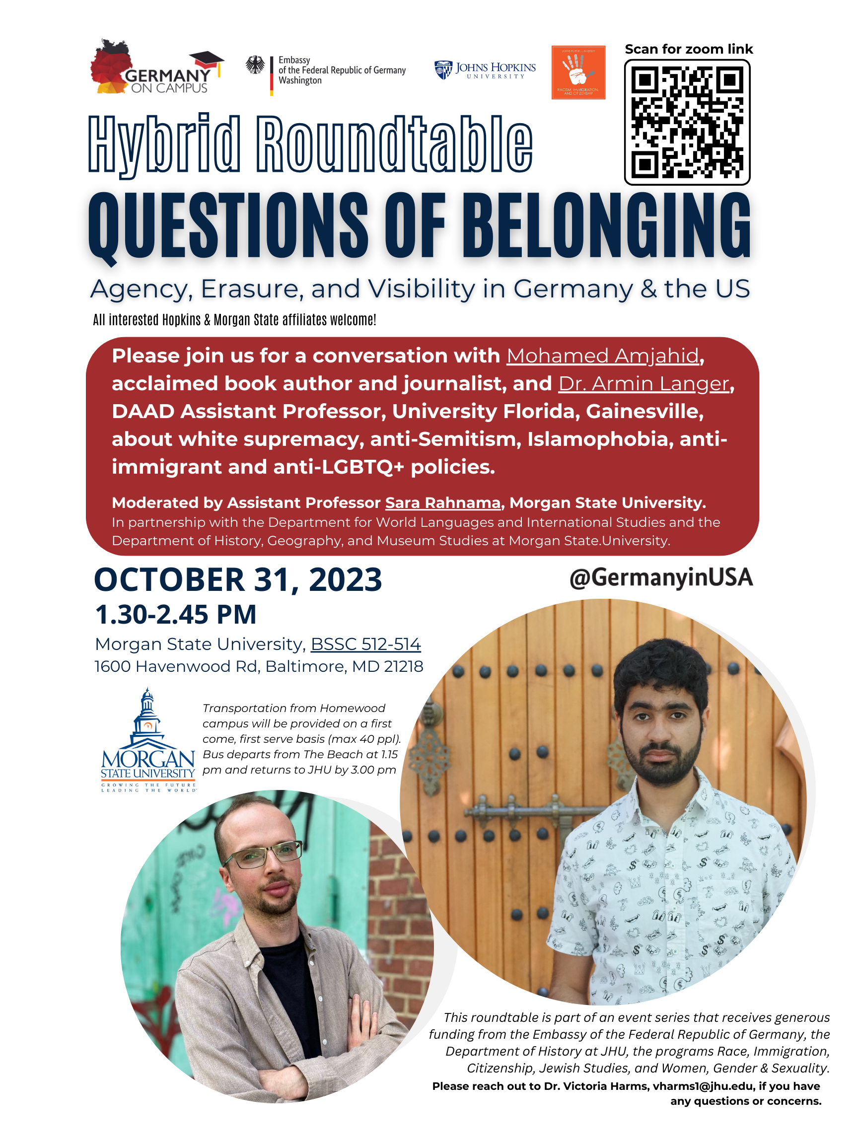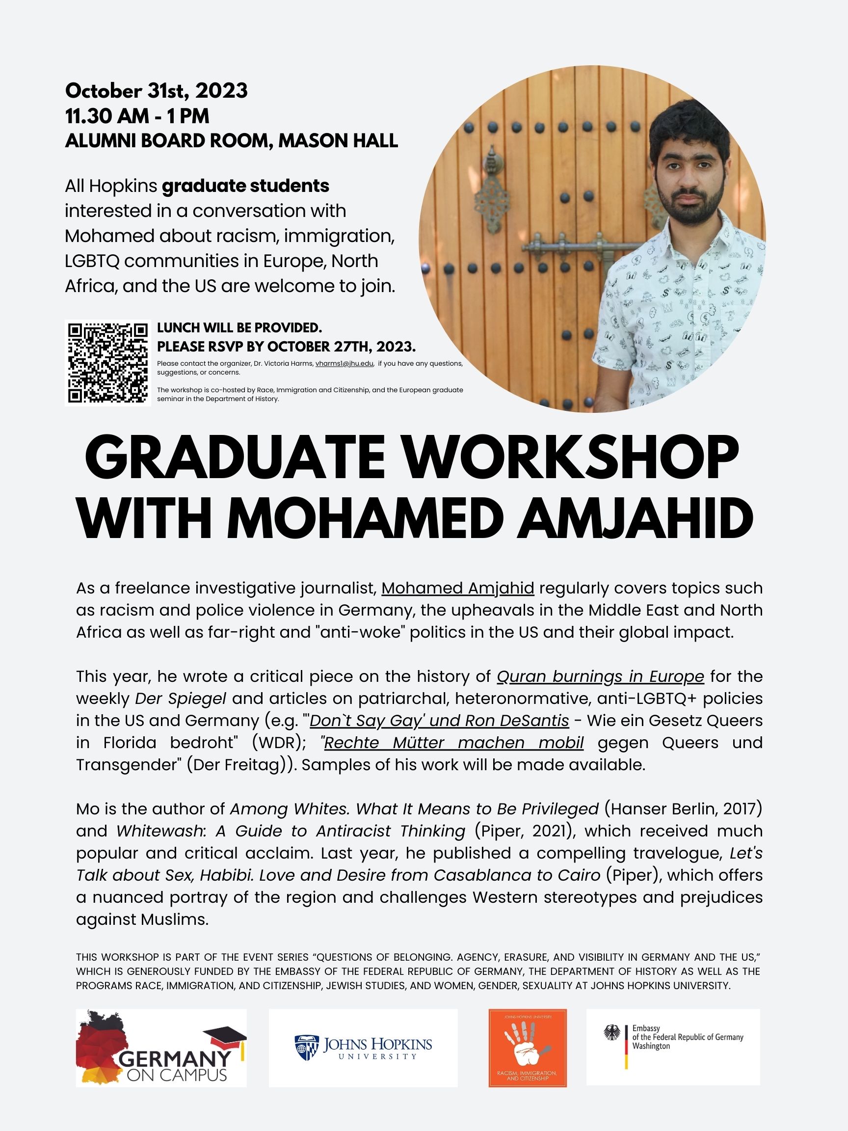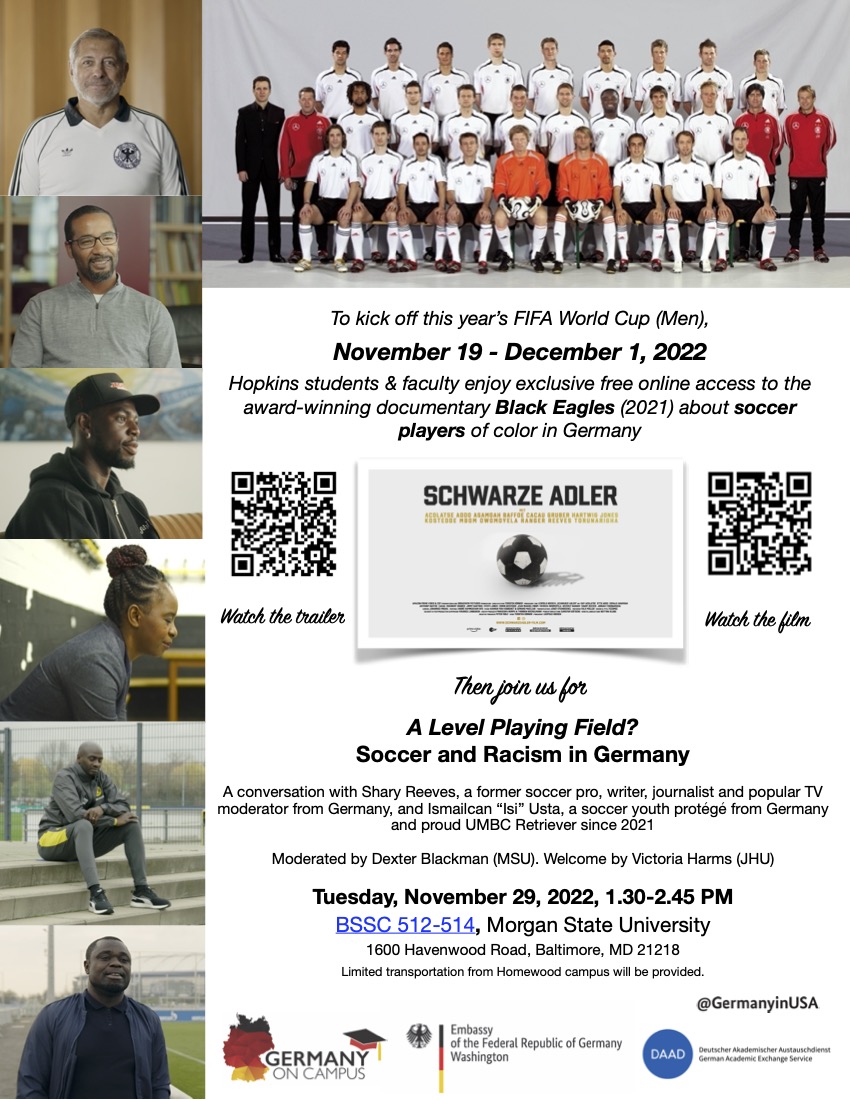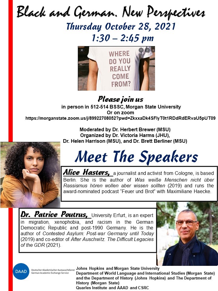 Event Series (Fall 2023): Questions of Belonging. Agency, Erasure, and Visibility in Germany and the US,” generously co-sponsored by the Embassy of the Federal Republic of Germany, the Department of History at Johns Hopkins University, and the programs Race, Immigration, and Citizenship (RIC), Jewish Studies, and Women, Gender, and Sexuality.”