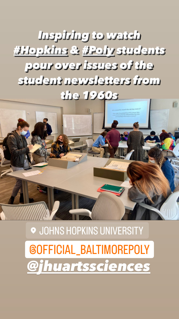In fall 2024, our 1968 seminar at Johns Hopkins had the great honor to partner with the AP African-American history class at the Baltimore Polytechnic Institute (thx to Dr. Maureen O’Neill and Patrice Frasier) and the Maryland Center for History and Culture (shout out to deborah Wood and Winter BearKing) for a third time. We were also grateful to Afro Charities, Deyane Moses and Oyinda Omoloja specifically, for working with us and offering a comprehensive workshop in the history and digital archive of the Afro, the oldest, continuously published, Black family-owned newspaper in the US. Special thanks as always to the Hop Retro Team and Allison Seyler for supporting our students and helping us better understand JHU’s history and place in Baltimore.